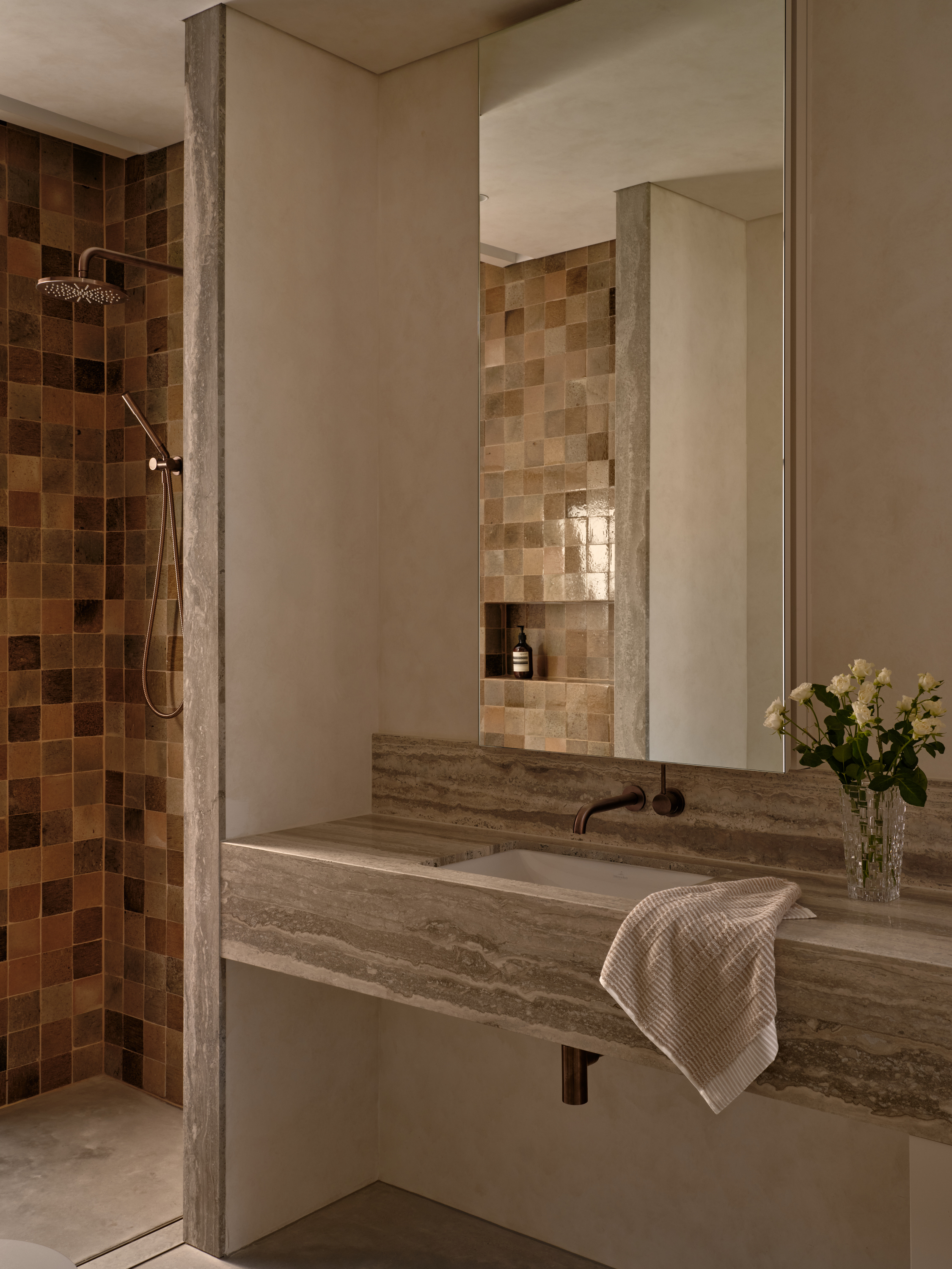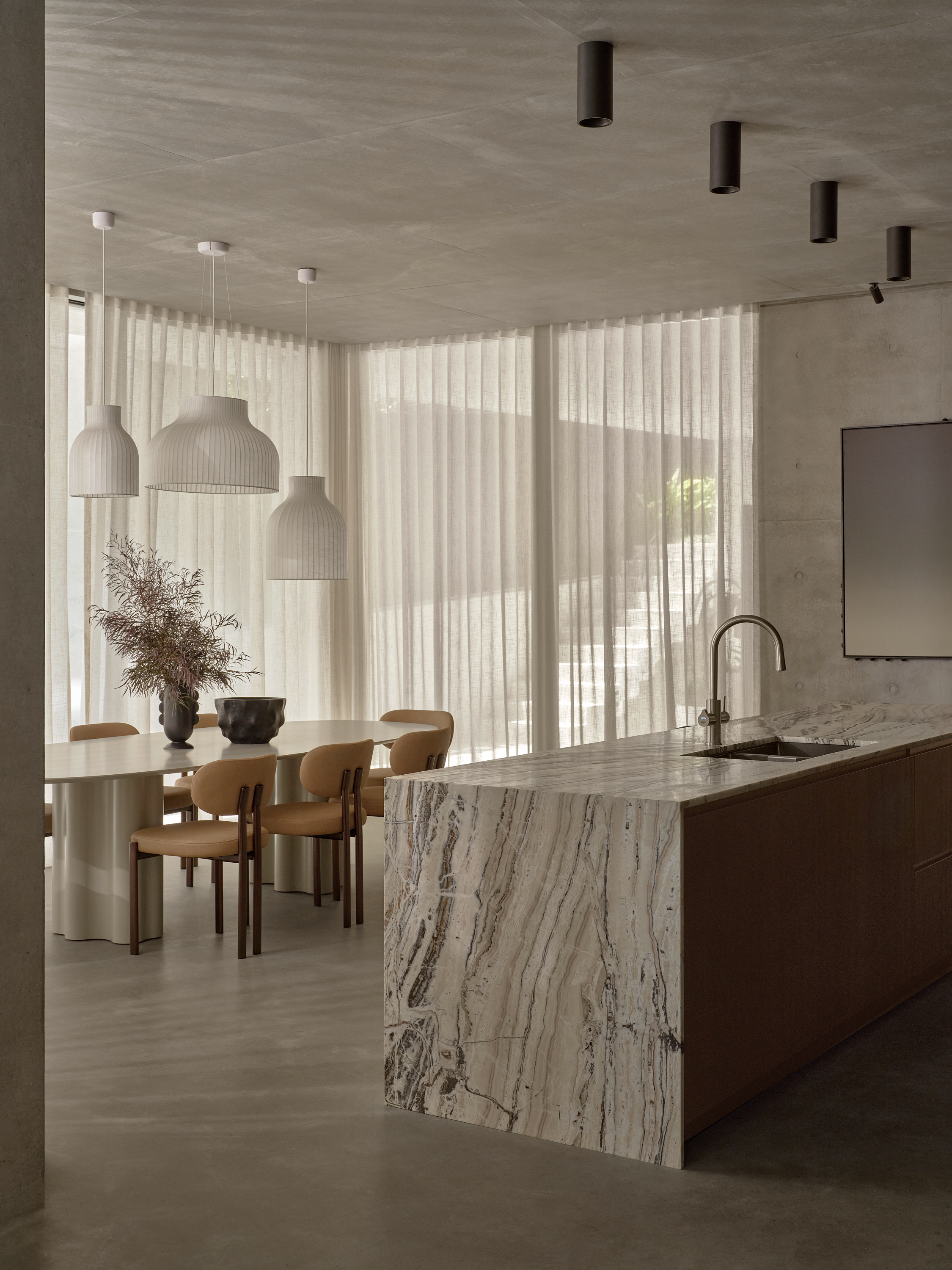 Sliding timber screens filter sun and heat throughout the day, while insulation and double glazing support a steady internal climate. Inside, raw surfaces meet warm timbers, tactile stone, and restrained colour, creating spaces that feel grounded and intimate.